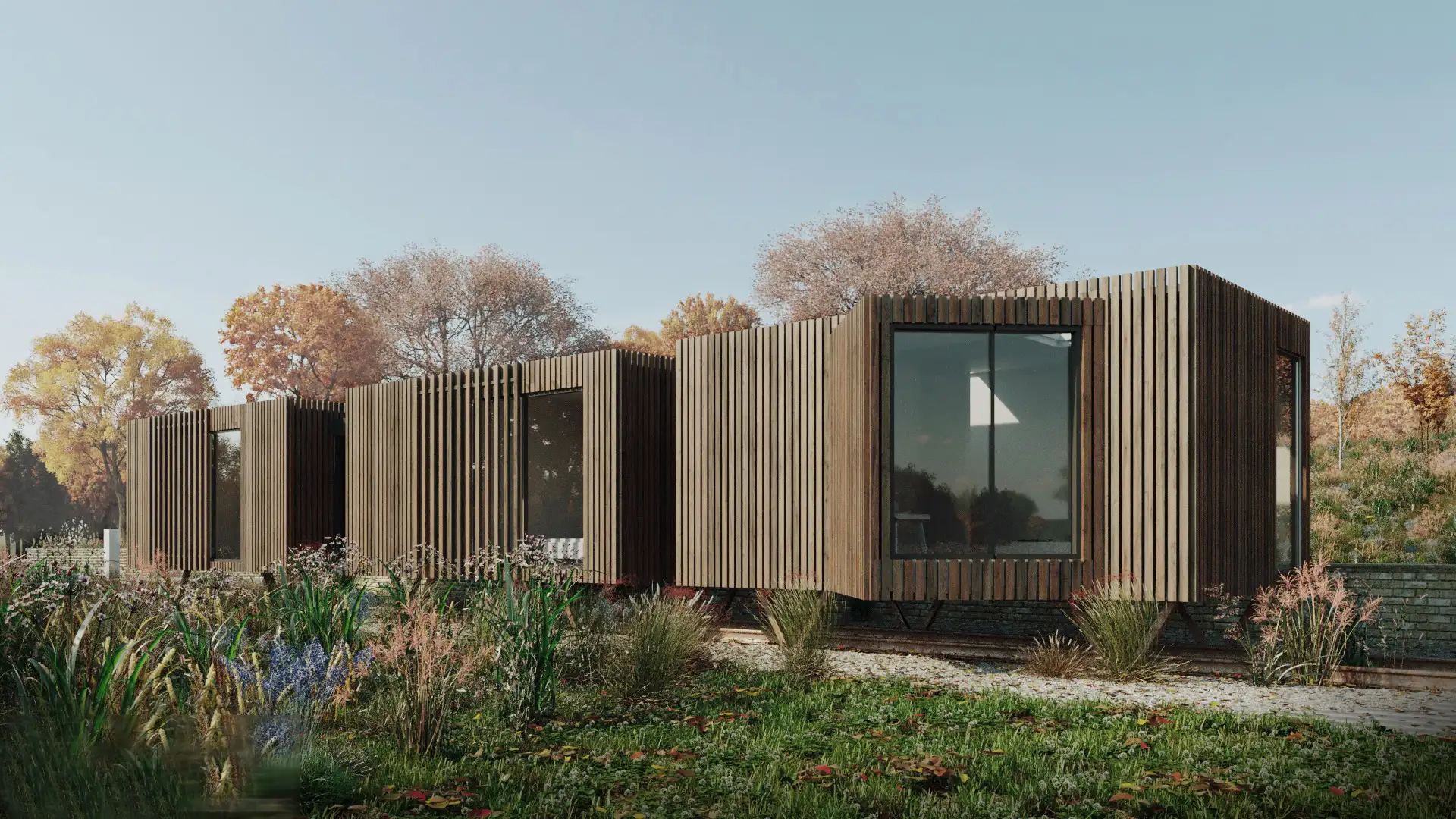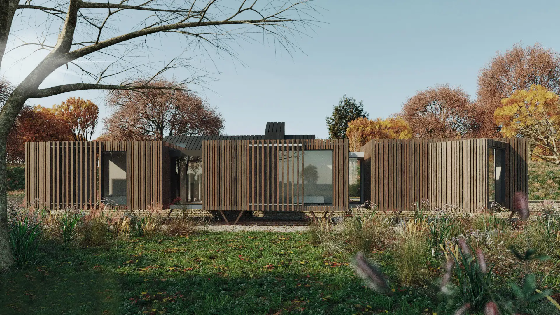 A timber framed living and kitchen building is created by the charred larch clad ‘ticket office’ whilst the bedrooms are created with timber framed ‘carriage’ pods sitting on lightweight steel structures. Sustainable larch cladding features as the prominent materiality; making reference to the finish of the original waiting room structure. The living (‘ticket office’) section of the design also takes clear cues from the form of the original building.